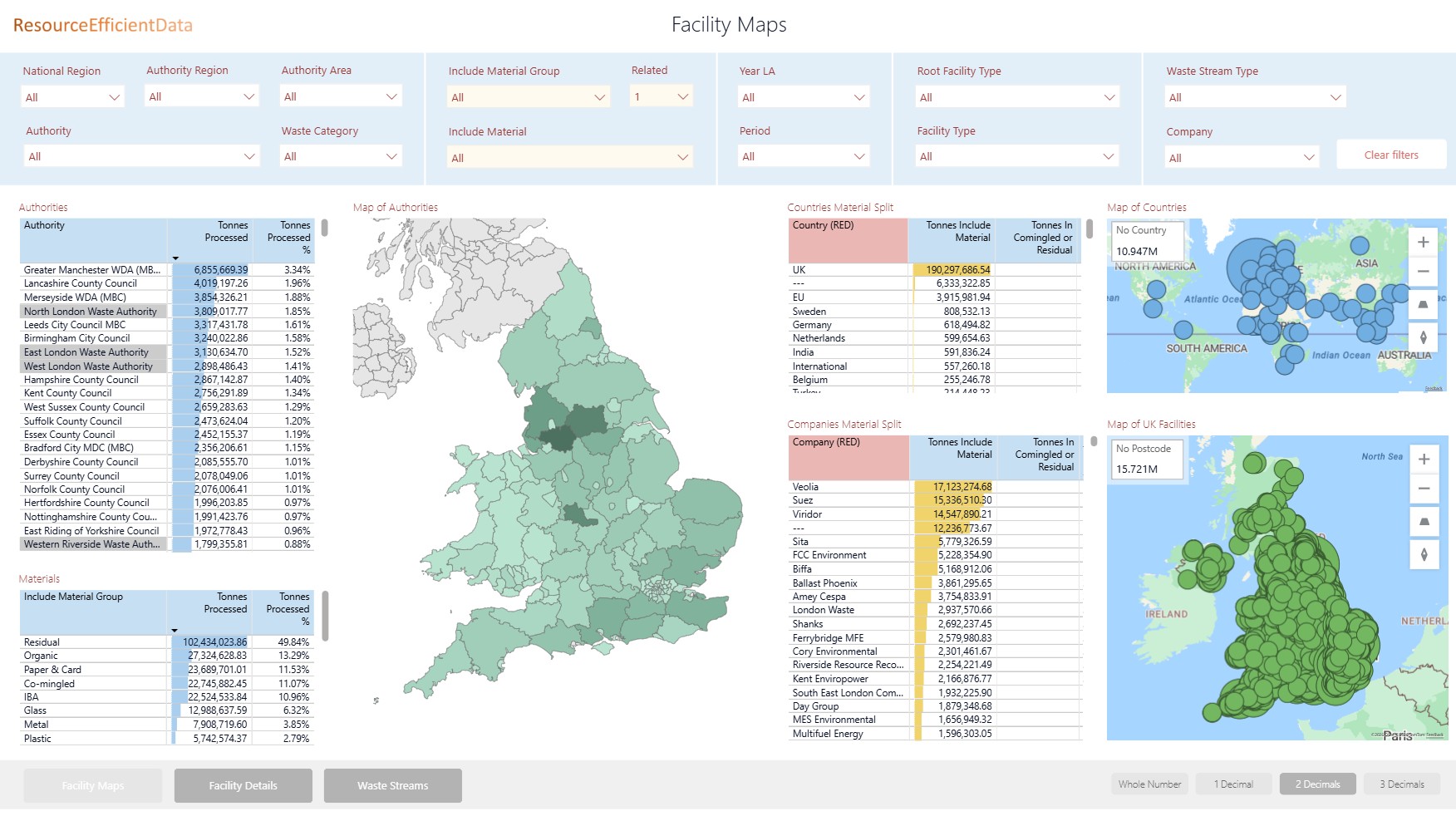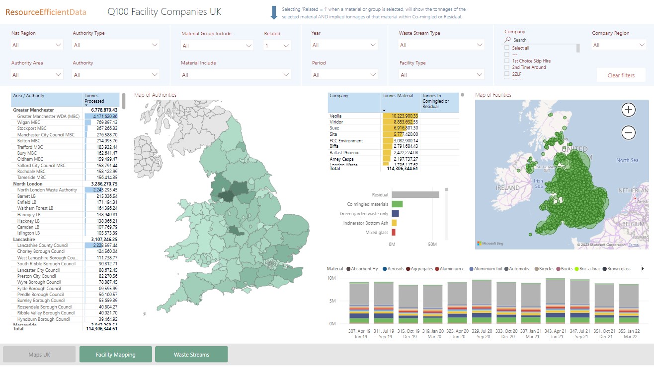 Summary of tonnages processed by facilities and companies (Q100) from Waste Data Flow